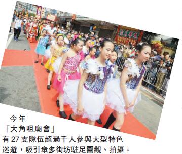 「大角咀廟會」持續一整天,金龍帶領60頭醒獅、27支隊伍超過千人參與大型特色巡遊,並邀請了來自中山、佛山等地的同胞、團體參與表演,助興開幕,在活動中作文化交流,體現和諧共融的精神。下午時分連番上演精采節目,包括18頭醒獅表演梅花樁、時裝表演、懷舊歌曲、中西舞蹈、千人盆菜宴,晚間還有壓軸節目500呎夜光龍及夜光鳳凰、鯉魚、夜光十二生肖等穿梭飛舞。大會今年也繼續撥出30個創業攤位,免費讓社區人士及青少年售賣創意及特色物品。