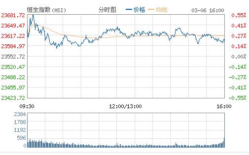 上周五美股三大指數收漲,美聯儲局主席耶倫表示3月中議息會議上極有可能加息,其講話后聯邦利率期貨顯示3月加息概率升至96%。恒生指數今早高開0.2%,開盤后漲幅擴大,最高漲逾百點,高見23691點,其后漲幅收窄,于23600點爭持,上午11時漲幅再次擴大,午后于23600點之上震蕩。截至收盤,恒生指數報23596.28點,漲0.18%;國企指數報1017.1點,漲0.26%;紅籌指數報3862.02點,漲0.2126%。大市成交額622.9億。