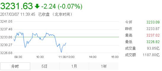 3月7日消息,滬深兩市早盤均出現震蕩橫盤走勢,滬指一度圍繞平盤線上下震蕩。創業板表現稍強,但在臨近早盤收盤,創指翻綠。截止上午收盤,滬指報3231.63,跌0.07%,創業板報1961.59,跌0.06%。