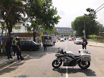 朝鮮大使館門口一輛朝鮮外交牌照的車試圖駛出使館,但被馬來西亞警方的車輛攔在外面。