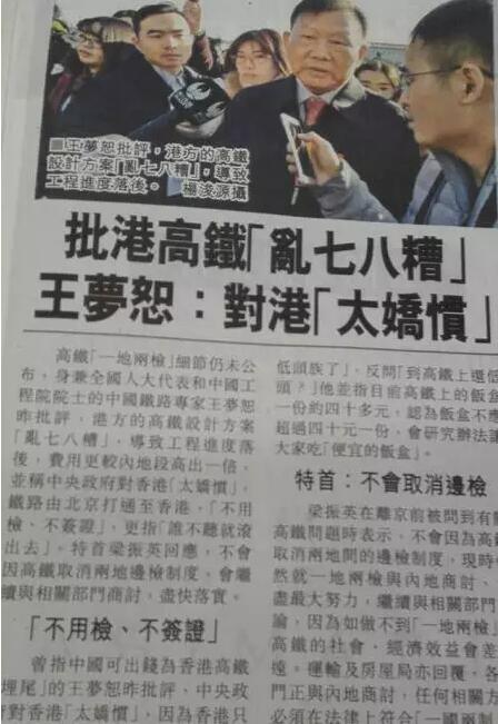 綜合港媒消息,全國人大代表、中國工程院院士、鐵路專家王夢恕,3月5日批評香港高鐵工程拖延太久,阻礙國家高鐵規劃。王夢恕指,走線更長的鐵路工程一般只要6年就可完工,但香港高鐵距離短、施工慢,造價高還要超支。對于“一地兩檢”問題,他認為一個國家內的鐵路“無需簽證或通關安排”,內地出發的高鐵本身亦已有安檢。他更指“中央對香港一直太驕慣”,每年巨額補貼香港,但部分港人仍不知好歹,甚至提出“港獨”。他甚至認為假如香港無法處理“一地兩檢”安排,不如取消高鐵。