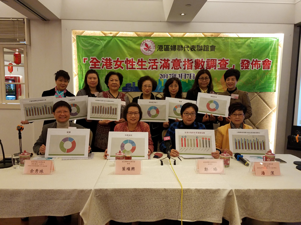 是次調查由港區婦聯代表聯誼會委託香港研究協會進行,機構於1月26日至2月17日,以電腦系統隨機抽樣方式,用電話訪問1026位18歲以上香港女性。研究設定包括10個領域,每個測量指標以1分為最不滿意,10分為最滿意(各領域平均分見附表)。總滿意度是由各領域的平均分相加所得,滿分為100分。受訪女性對生活滿意度評分為57.6分。