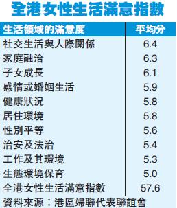 【香港商報網訊】記者潘仲男報道:今日是三八婦女節。港區婦聯代表聯誼會一項調查發現,本港女性對生活總滿意度(57.6分)只屬中等水平,聯誼會認為情况并不理想。調查又發現,最滿意為社交生活與人際關系(6.4分),滿意度排名最低為生態環境保育(5.0)分;若以職業劃分,中高層職位女性對生活滿意度較高。