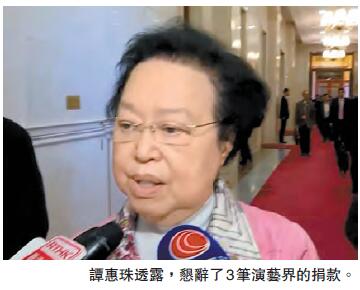 一批演藝界人士日前向「敬言仁基金」轉交約777萬元捐款,譚惠珠透露,鑑於有人對捐款提出疑問及炒作,因此懇辭了其中3筆來自演藝界的捐款,但她拒絕透露捐款人身份及細節。