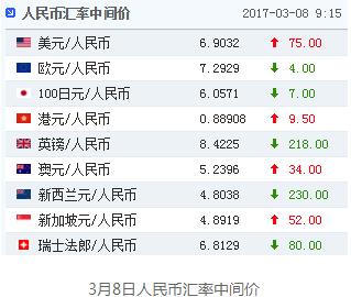 3月8日,人民幣(6.9031, 0.0032, 0.05%)兌美元中間價報6.9032,為近兩個月來最低,較上日中間價貶值75個基點。