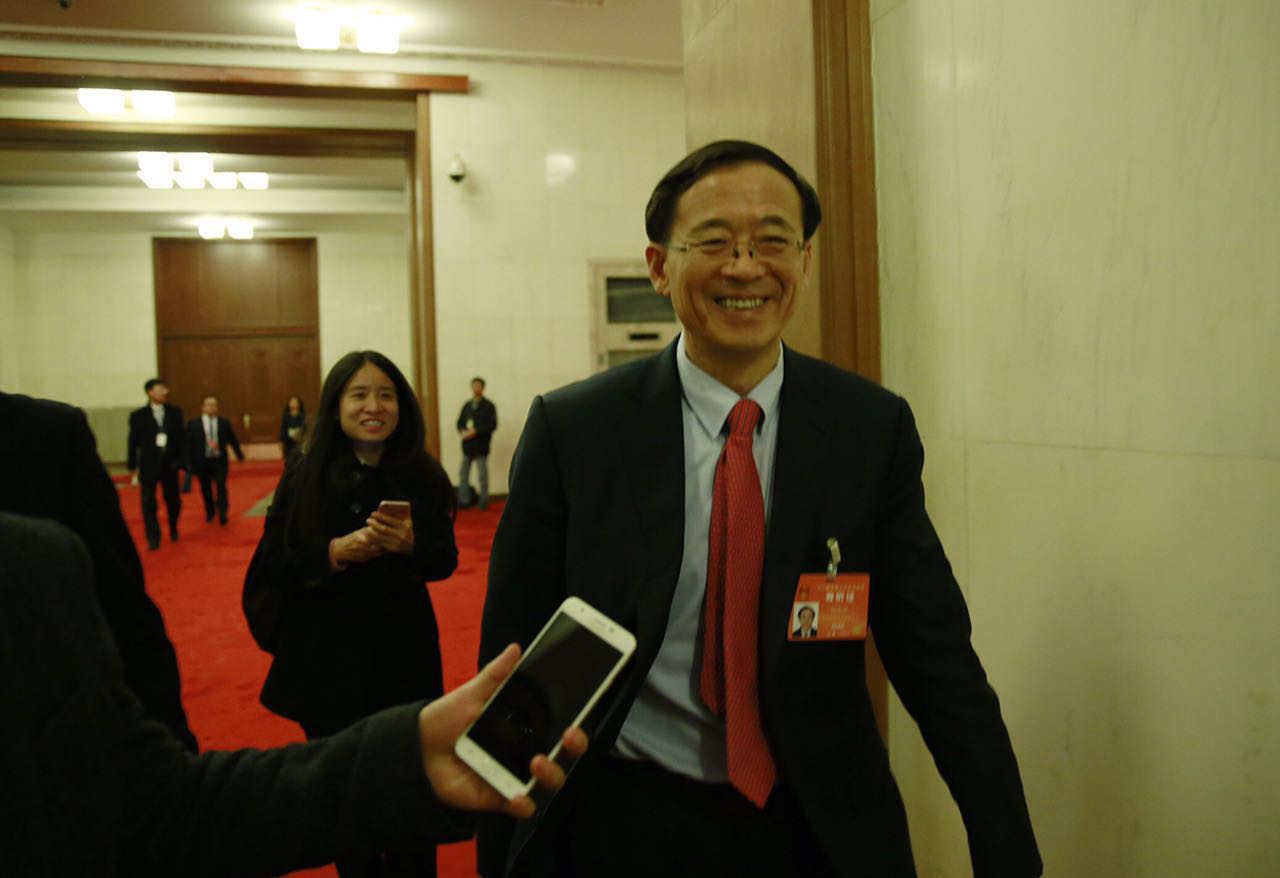 到了會議結束,部長通道繼續開工,正當國務院港澳辦主任王光亞在會后問答時,行家發現工作人員正引着新任銀監會主席郭樹清,試圖悄悄從記者后面繞過。