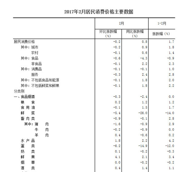 2017年2月份,全國居民消費價格總水平同比上漲0.8%。其中,城市上漲0.9%,農村上漲0.6%;食品價格下降4.3%,非食品價格上漲2.2%;消費品價格下降0.1%,服務價格上漲2.4%。1-2月平均,全國居民消費價格總水平比去年同期上漲1.7%。
