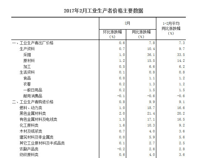 2017年2月份,全國工業生產者出廠價格同比上漲7.8%,環比上漲0.6%。工業生產者購進價格同比上漲9.9%,環比上漲0.8%。1-2月平均,工業生產者出廠價格同比上漲7.3%,工業生產者購進價格同比上漲9.1%。