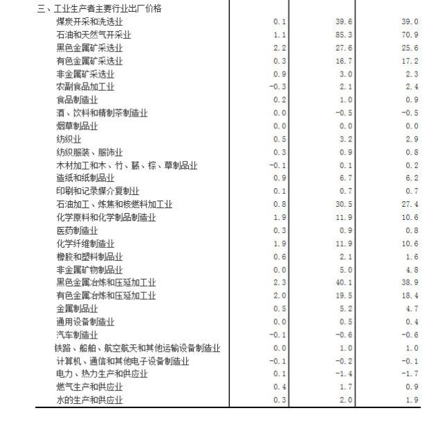 工業生產者出廠價格中,生產資料價格同比上漲10.4%,影響工業生產者出廠價格總水平上漲約7.6個百分點。其中,采掘工業價格上漲36.1%,原材料工業價格上漲15.5%,加工工業價格上漲6.6%。生活資料價格同比上漲0.8%,影響全國工業生產者出廠價格總水平上漲約0.2個百分點。其中,食品價格上漲1.1%,衣著價格上漲1.3%,一般日用品價格上漲1.5%,耐用消費品價格下降0.6%。
