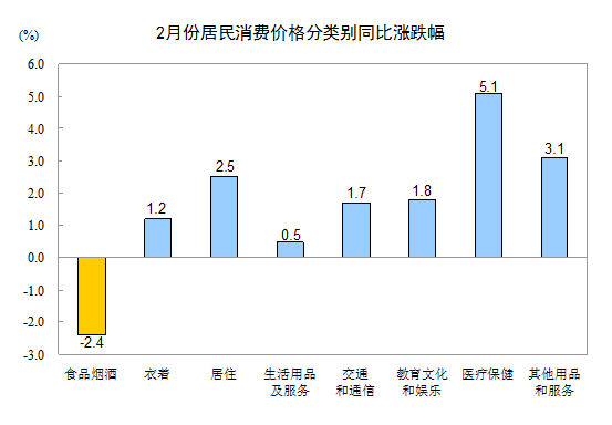 2月份,其他七大類價格同比均有所上漲。其中,醫療保健、其他用品和服務、居住、教育文化和娛樂、交通和通信、衣著、生活用品及服務價格分別上漲5.1%、3.1%、2.5%、1.8%、1.7%、1.2%和0.5%。