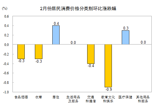 2月份,其他七大類價格環比兩漲三降兩平。其中,居住、醫療保健價格分別上漲0.4%、0.3%;教育文化和娛樂、交通和通信、衣著價格分別下降0.9%、0.4%、0.3%;生活用品及服務、其他用品和服務價格持平。