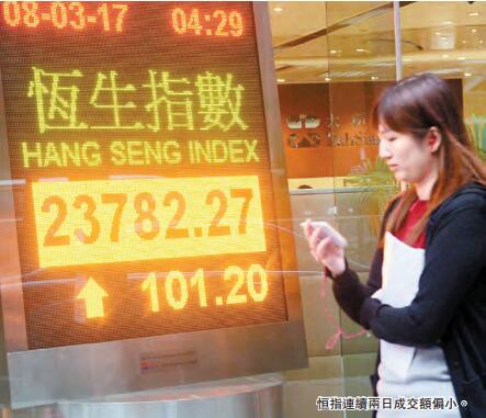 兩會召開期間,大市觀望氣氛持續,全日升101點,收報23782點,成交689億元;國指報10280升50點,成交132億元。形態上,MACD熊差雖然呈現終止擴大趨勢,但指數已連續兩日成交額偏小,說明反彈的動力不足,目前市況正好是考驗投資者耐性,包括是否可以忍手,以及在作出決定後便願意等待至有明確方向。預計恒指支持位23386點,首個阻力位在24000點,下一個阻力位為24364點。