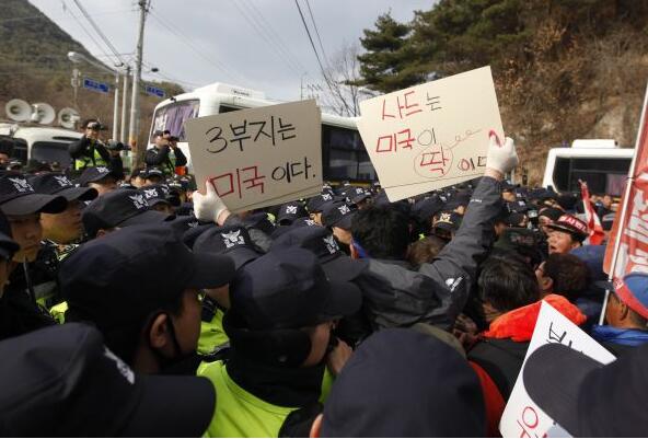 3月8日,在韓國慶尚北道星州郡的星州高爾夫球場附近,抗議民眾與警方對峙。 新華社記者姚琪琳攝