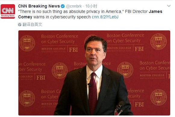美國有線電視新聞網3月8日報道稱,科米8日出席由FBI與波士頓學院(Boston College)共同舉辦的首屆波士頓網絡安全會議。他在會中談到,自從2013年前國安局雇員斯諾登爆料國家安全機構監聽民眾之后導致各界關注的計算機加密問題。他認為美國人不應該期待擁有絕對隱私,“在美國是沒有絕對隱私可言,也沒有逍遙法外之處。”