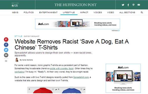 《赫芬顿邮报》称,写有一些猎奇或好玩字眼的文化衫、T恤衫在世界各地不是什么新鲜事,但也有人把一些带有种族歧视性质的内容印上去。让用户自己设计和销售定制服装是Spreadshirt的一种营销模式。北美华裔社区一家网站发现,3月初,Spreadshirt的两个用户定制了带有冒犯中国人内容的T恤,其中一款T恤写有“救一只狗,吃一个中国人”,另一款写有“救一条鲨鱼,吃一个中国人”。尽管这两款T恤并不是由Spreadshirt设计,但还是有相当多的人对该公司允许销售此类产品感到失望。