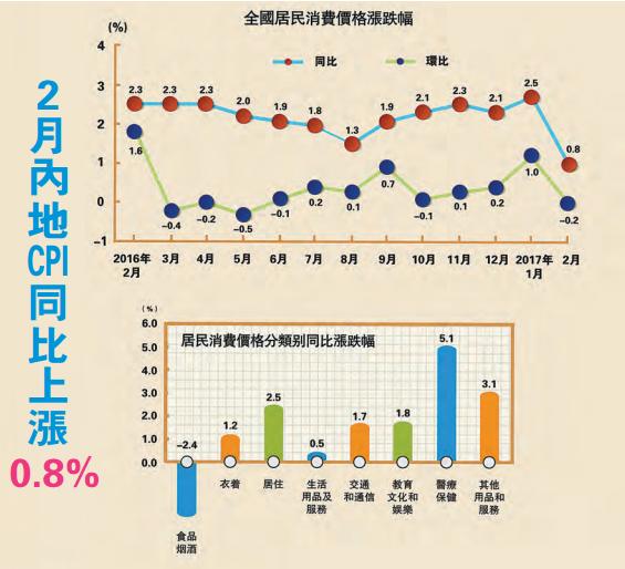 【香港商報网訊】國家統計局昨日公布的2月CPI和PPI呈一冷一熱的分化走勢,2月CPI同比意外跌至0.8%,創2015年1月來最低增速,遠不及預期1.7%和前值2.5%;同時2月PPI再度走高,同比7.8%,創2008年9月以來最高。統計局解讀數據稱,CPI環比略降主因食品價格出現明顯回落,以及節后外出旅游人數減少;同比漲幅回落主要受翹尾因素變化影響。核心CPI基本延續了去年的溫和上漲態勢。PPI漲幅擴大主要受去年2月份價格大幅下降影響。