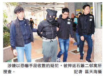 新界北總區重案組張寶月高級督察表示,警方接獲報案後調查,昨日在葵涌及深水?拘捕兩名男子,涉嫌以刑事毀壞及刑事恐嚇,涉及今年1月19日、2月16日及2月19日,共3宗在天水圍區的收數活動,受害人24至56歲不等,自己或家人欠債,款項由8000元至20萬元。探員昨日將其中一名疑犯押返其葵涌石籬二石富樓寓所搜屋,檢獲收數字句的紙張。