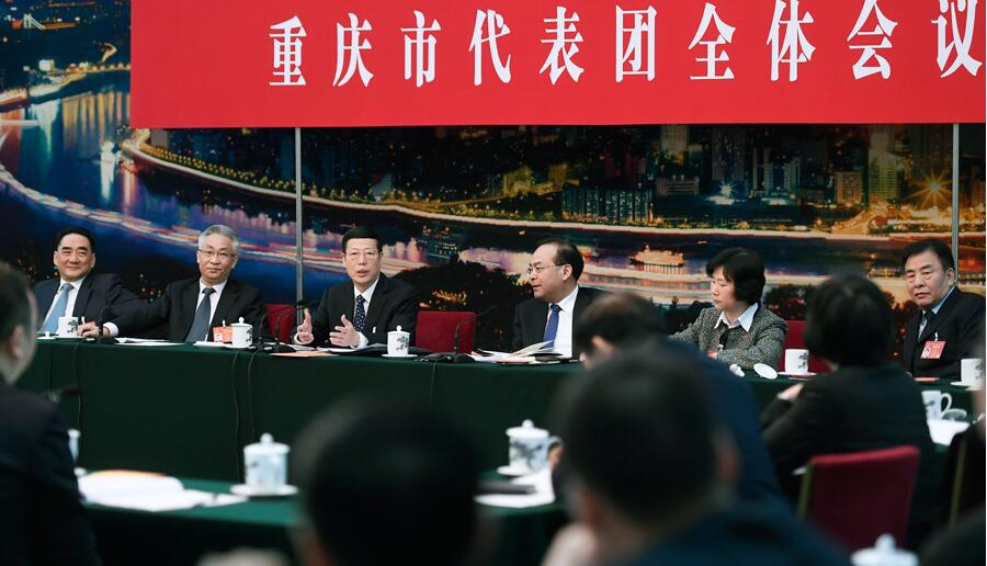 在聽取代表們的發言后,張高麗說,完全贊成張德江委員長所作的全國人大常委會工作報告。他指出,過去一年,重慶經濟社會發展取得了新的成績,希望重慶深入學習貫徹習近平總書記系列重要講話精神和治國理政新理念新思想新戰略,貫徹落實總書記對重慶工作“一個目標”“兩點定位”“四個扎實”的要求,在全面建成小康社會中邁出新的步伐。要發揮西部大開發重要戰略支點作用,積極融入“一帶一路”建設和長江經濟帶發展;深入推進供給側結構性改革,抓好“三去一降一補”重點任務;大力實施創新驅動發展戰略,振興先進制造業,加快推動經濟轉型升級;統籌城鄉區域協調發展,著力形成平衡發展結構;保護好三峽庫區和長江母親河,筑牢長江上游重要生態屏障;切實保障和改善民生,確保圓滿完成脫貧攻堅任務,努力開創重慶改革發展新局面。
