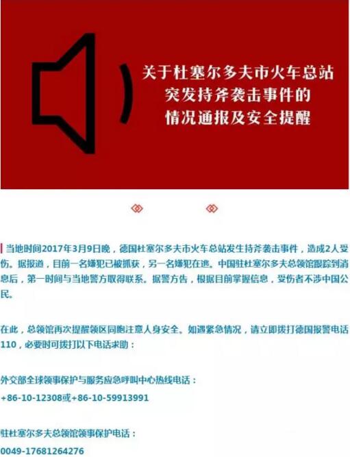 中國駐杜塞爾多夫總領事館得到消息后,第一時間與當地警方取得聯系。根據目前掌握的信息,受傷者不涉中國公民。