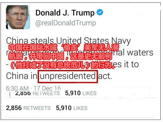 當地時間16日早上6點半,美國總統當選人特朗普對中國在南海捕獲美國無人潛航器一事,發布推特抨擊中國。但是在推特中,他將“史無前例”一詞錯誤拼寫為“沒有總統范兒”一詞。