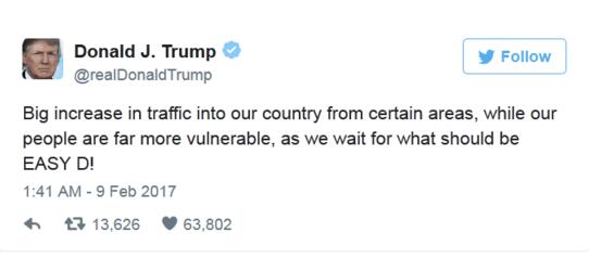 2月8日,特朗普發推文對此前發布的“限穆令”做出辯護,并再次對阻止這項禁令的美國司法機構做出抨擊,他寫到:“在我們等待一項本來應該是“EASY D”的期間,從某些地區進入我們國家的人數大大增加,但我們的人民卻是非常脆弱的。”據美國在線俚語詞典“城市字典”的解釋,該詞是“淫婦”的意思。
