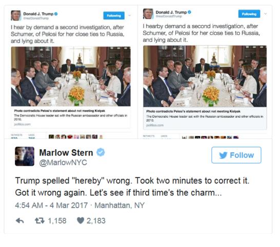 當地時間3月3日下午,特朗普在“推特”上轉發推文時,兩次打錯英語單詞“hereby”,發完后刪除,然后重新發,第三次才拼寫正確。