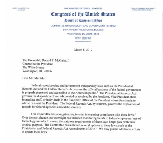 據報道,這封信函是由議員查菲茨(Reps. Jason Chaffetz )和卡明斯(Elijah Cummings )發給白宮法律顧問唐納德·麥克加恩的,他們在信中以特朗普拼錯單詞和刪除推文的習慣為例,警告稱,如果被刪除的推文沒有存檔,則“可能違反總統記錄法案”。