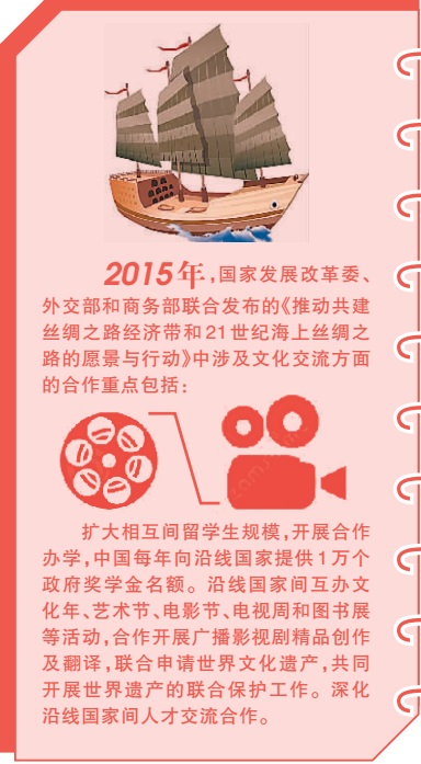 几年来,“一带一路”沿线的文化沟通呈现出多彩多姿的态势——沿线国家间人才交流合作不断深化,相互间留学生规模日益扩大,合作办学持续开展;沿线国家间互办文化年、艺术节、电影节、电视周和图书展等活动,合作开展广播影视剧精品创作及翻译,联合申请世界文化遗产,共同进行世界遗产的联合保护……