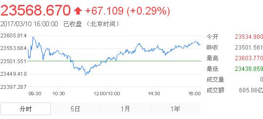 3月10日消息,港股周四收跌,隔夜美股漲跌互現,ADP就業數據強勁,進一步提升了3月美聯儲加息的概率,加上市場等待備受關注的2月非農就業數據,整體投資氛圍偏謹慎。恒指全天成大V形走勢。今日早盤,恒指高開低走,盤中跌跌撞撞,最終掉頭向下,跌破235000點之支持,低見23438.86點。早盤幾乎平收。午后恒指反彈,收復23500點,高見23603.77點。截止收盤,恒指漲0.29%,報23496.8點;國企指數跌0.26%,報10069.10點;紅籌指數跌0.12%,報3856.11點。大市成交686億。