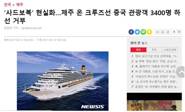 “薩德報復成為現實”,韓國紐西斯通訊社12日的報道這樣評價中國游客集體拒絕下船事件。報道稱,作為應對部署“薩德”的反制措施之一,中國方面已經嚴控本國公民赴韓旅游,從3月16日以后,中國游客將從來韓的國際郵輪上全面消失。