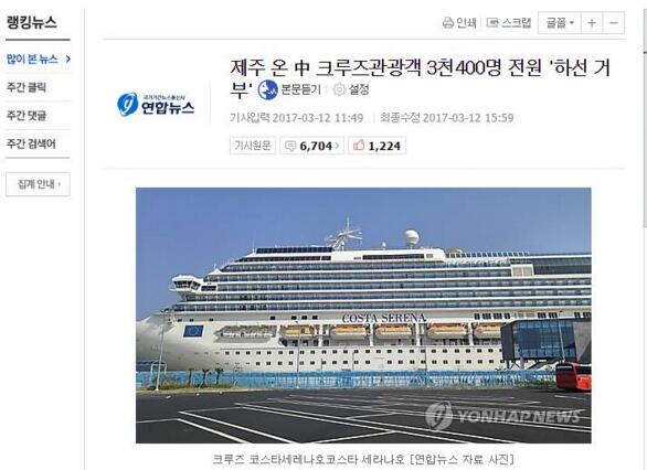 據韓聯社12日報道,正當中國發出“旅游禁韓令”持續發酵之時,韓國首次發生了乘坐國際郵輪來到濟州的3400余名中國團體游客拒絕下船事件。