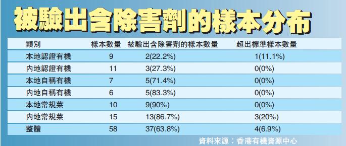 香港有機資源中心於去年10月至今年1月,分別從全港的濕街市、超級市場及有機農墟采集58個蔬菜樣本作除害劑含量測試。結果顯示,自稱有機的本地及內地菜,有71%(5個樣本)及83%樣本(5個樣本)含殘餘除害劑;而獲內地或本地認證,也有27%(3個樣本)及22%樣本(2個樣本)含殘餘除害劑。