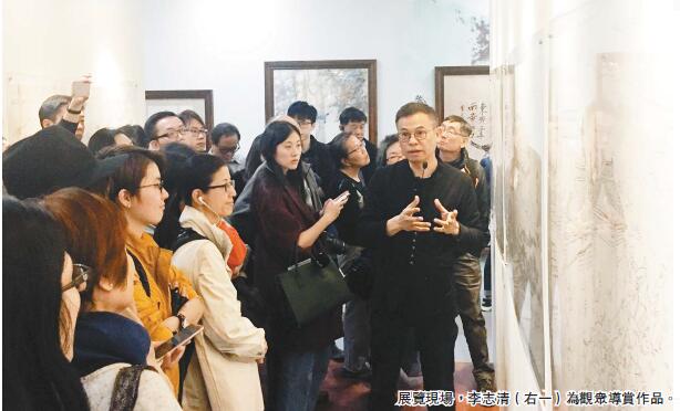 在李志清看來,水墨的創作是不同角度、不同取材的延伸創作,「我相對較多的選取小說中的抽象成分,再加以感性地創作。」如其最具代表的作品《射雕英雄傳》,則著重表達人物關係與故事的深層意境,同時加入多些中國畫的元素,將這個家喻戶曉的武俠巨著進行重新演繹。又如其創作的神雕俠侶及楊過的場景,「通過水墨特有的韻味,製造出空靈感,將人物與雕佔據二分之一的畫面,又將雕故意做到如心型般,而雕的眼神是往回看的」,李志清說,「這與楊過站在一起,要等小龍女16年,那種孤獨的身影是一個對照。特別的構思能帶引讀者的視角進入其中,捕捉主人公的精神面貌。」在現場,李志清亦特地講述了一幅關於《天龍八部》的水墨畫。「我們許多人只知道天龍八部是一部武俠故事,但深層的背後,其實有佛學的意境在其中。『天龍八部』這名詞出於佛經,指的是佛說法是圍繞在他周圍的八種神道怪物。金庸以八部象徵不同的現實人物,在小說中挖掘深刻的人生。」他說,「這幅畫作,我沒有遵循原作的劇情,只是按照自己的理解,把天龍八部的武俠故事和天龍八部的佛教故事裏的人物,放在一個畫面,產生一種重疊感」,「如此直接呈現在觀眾眼前,其效果有一種直接的視覺震撼」。