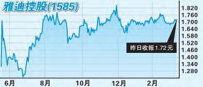 中國電動兩輪車製造商雅迪集團(1585)早前公布去年業績,表現尚算可以,但由於內地要改善空氣質素,所以估計公司前景不錯。公司於去年5月19日以每股1.72元上市,過去大半年,股價在附近水平徘徊,以走勢看,應在現水平吸貨,在消化街貨或沽壓,等待向上突破的時機。