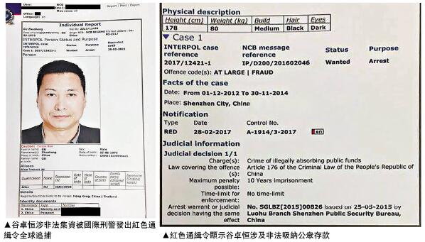 图:谷卓恒涉非法集资被国际刑警发出红色通缉令全球追捕