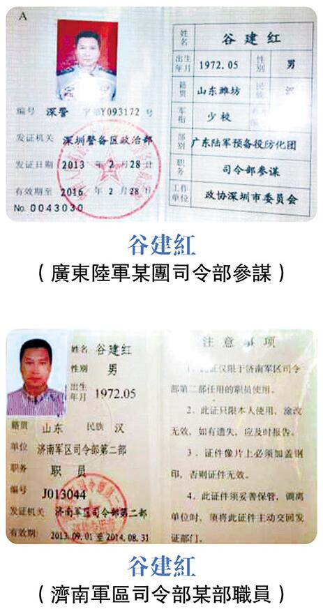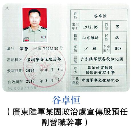 据大公报查证,谷卓恒至少持有两张军官证、两张身份证,以及一张军队的职员证。但其中姓名及身份各有不同,令人眼花缭乱。其中一张2014年发出的军官证,是以“谷卓恒”的身份,证件上的部别职务为“广东陆军某团预任副营职干事”,工作单位为“中国某研究会”。 另一张2013年发出的军官证则署名“谷建红”,其部别和职务亦变成“广东陆军某团司令部参谋”,工作单位则是“某市委员会”,然而两张证件的出生年月、籍贯、民族、军衔,以及发证机关均一致。同样是一张2013年发出,署名“谷建红”的军队职员证中,却显示其是“济南军区司令部某部职员”。