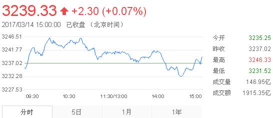3月14日消息,早盤兩市指數小幅低開后,繼續維持窄幅震蕩走勢,午盤后滬指逐漸走弱,小幅翻綠,創業板指數今日弱于滬指,早盤即低開低走,至收盤滬指小幅翻紅,創業板翻綠,量能較昨日小幅縮量。截至收盤,滬指報3239.33,漲0.07%;深成指報10531.73點,跌0.21%;創指報1958.02,跌0.65%。