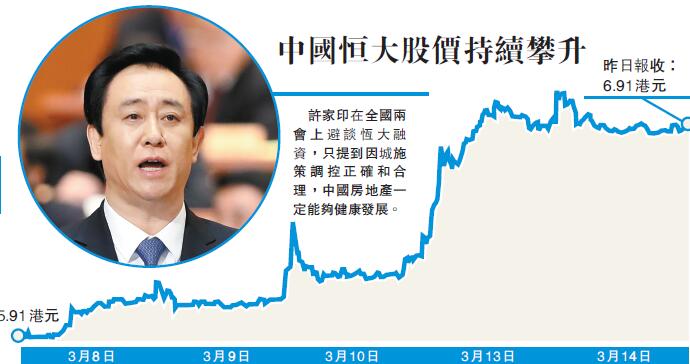 而在稍早前,政協記者會上,全國政協常委、恆大集團董事局主席許家印並沒有直面回答關於房地產調控政策如何影響恆大融資的問題。