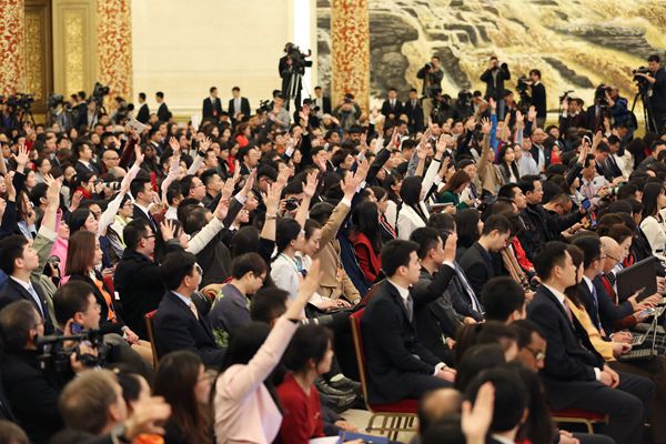 3月15日,國務院總理李克強在北京人民大會堂與中外記者見面,并回答記者提問。這是記者在舉手提問。新華社記者金立旺攝