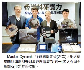 Master Dynamic行政總裁江爭表示,傳統在鑽石防偽,會採用刻印技術,在鑽石造成輕微損耗,但公司與周大福集團合作,則是以其只有納米尺寸、極為精細的聚焦離子束專利技術,成功創造世界上最小、無損鑽石本身形態和沒有化學殘留物的納米鑽石印記,相信能引領珠寶業的發展。
