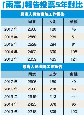 從最高法來看,自周強擔任院長以來,反對票數從2014年的378票降至2017年的180票,數量減少逾一半。從最高檢來看,自曹建明擔任檢察長以來,反對票數則從2009年的505票降至2017年的180票,數量銳減。