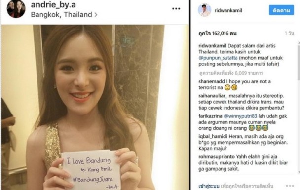 泰國一名當紅女星,近日在社交網上載一張她手持以英文寫上“我愛萬隆”(I Love Bandung)卡片的照片,並@了萬隆市長。萬隆市長回應時笑稱:“收到泰國美女明星的消息,希望你不是男生。”。不料事件引起風波,網民紛紛批評市長言論不當,後者最終被迫道歉。