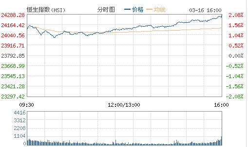 今日凌晨美國聯邦儲備委員會宣布將聯邦基金利率目標區間上調25個基點到0.75%至1.00%水平,符合市場普遍預期。香港金管局今早也宣布,基本利率根據預設公式上調25基點至1.25 厘,即時生效。恒生指數今早高開1.31%,開盤后漲幅擴大,之后走勢收窄,其后于23400點之上震蕩,午后漲幅再次擴大,最高漲逾400點,高見24271點,創逾六個月高位。截至收盤,恒生指數報24288.28點,漲2.08%;國企指數報10526.46點,漲2.47%;紅籌指數報4006.64點,漲2.24%。大市成交額1022億。