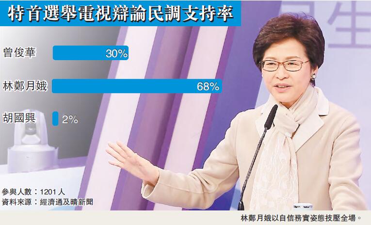 「經濟通」與《晴新聞》針對3位特首候選人早前於電子媒體論壇的表現,作了民調。截至昨晚8時,參與人數有1201人,認為林鄭月娥表現較佳的達68%,而曾俊華的支持度為30%,認為胡國興較佳的僅有2%。林鄭月娥以大比數「完勝」。