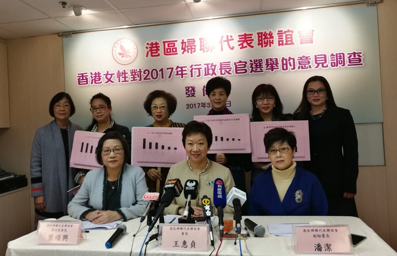 港區婦聯代表聯誼會於3月5至12日期間,以電腦系統隨機抽樣電話訪問了1096個本港女性,結果發現最多受訪女性表示下屆行政長官最需要具備的條件為有助促進社會和諧,其次是堅持「一國兩制、港人治港、高度自治」,以及中央政府信任,反映不少女性重視社會和諧及「一國兩制」的實施。