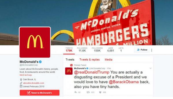 雖然推文被迅速刪除,但已在互聯網上傳開。麥當勞公關部發言人在一份聲明中說,“據調查,我們確定是‘推特’賬號被外人攻破。我們已迅速實施了保護措施,而且為這條推文道歉”。
