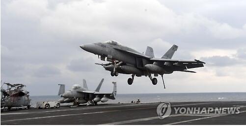 3月14日,F/A-18戰斗機在“卡爾·文森”號核動力航母上降落(韓聯社圖)