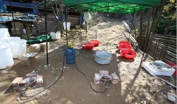 11月13日一早,專案組派出偵查員佯裝附近村民,采取繞道迂回的方法,從沒有路的另一側山腳徒步上山。一路上,一股股夾帶臭味的煙霧迎面撲來,經驗豐富的民警清楚這就是制毒散發出來的味道。經過2個多小時的艱難攀爬,民警到了山頂附近的一座鐵塔邊。為看清煙霧是從何處飄出來,民警直接爬上鐵塔,利用望遠鏡細心進行觀察,并發現裊裊煙云從雙青村委會背后的一工棚處飄出,可以判斷那里就是制毒團伙的窩點。