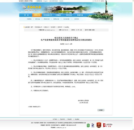 哈爾濱市政府網站公布的《哈爾濱市人民政府關于禁止生產經營焚燒冥紙冥幣等封建迷信喪葬用品有關事宜的通告》。