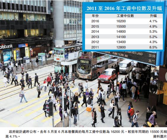 【香港商報网訊】記者莊海源報道:政府統計處昨公布,去年5月至6月本港户員(不包括政府户員和《最低工資條例》所豁免的實習學員、工作經驗學員、留宿家庭傭工)的每月工資中位數為16200元,較前年同期的15500元高4.1%。雖然工資有所上升,但加幅卻是過去6年來最低。統計處數據顯示,去年5月至6月的户員人數為301.29萬人,其中約52%為男性,48%為女性;男女户員以及不同年齡組別、教育程度、職業組別、行業主要户員的每月工資中位數均錄得升幅。